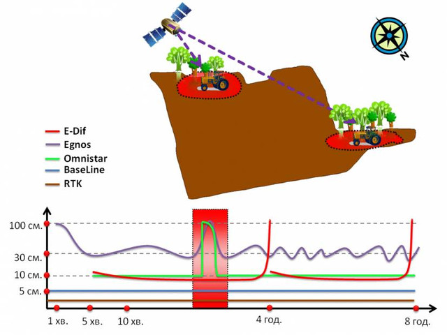 Існують різні фактори, що впливають на точність GPS-сигналу. Тому, на практиці точність коригуючого сигналу протягом часу постійно змінюється. Основним факторами, що впливають на точність сигналу під час роботи на полі є лісосмуги та лінії електропередач. Для наочного зображення практичної точності різних коригуючих сигналів пропонуємо наступний графік: