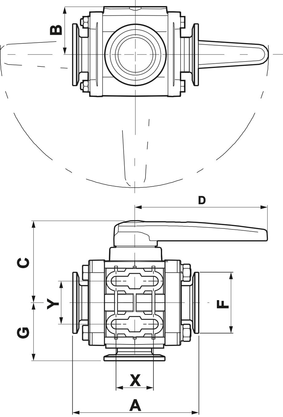 Кран 3-ходовий Arag 453 (фланець) фіксується хомутом для з’єднання фланців, де у центрі знаходиться ущільнення.