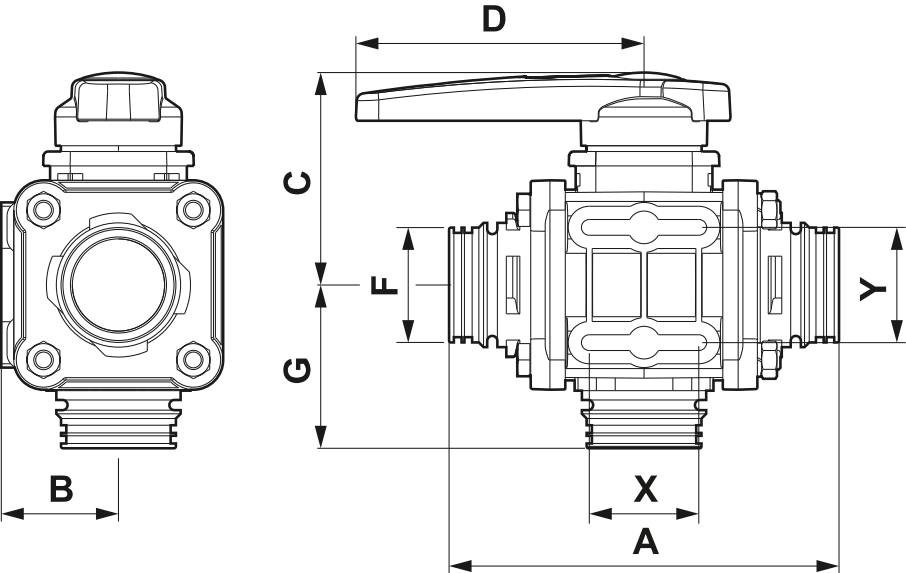 3-ходові кульові крани зі стяжними болтами та нижнім вилковим з'єднанням