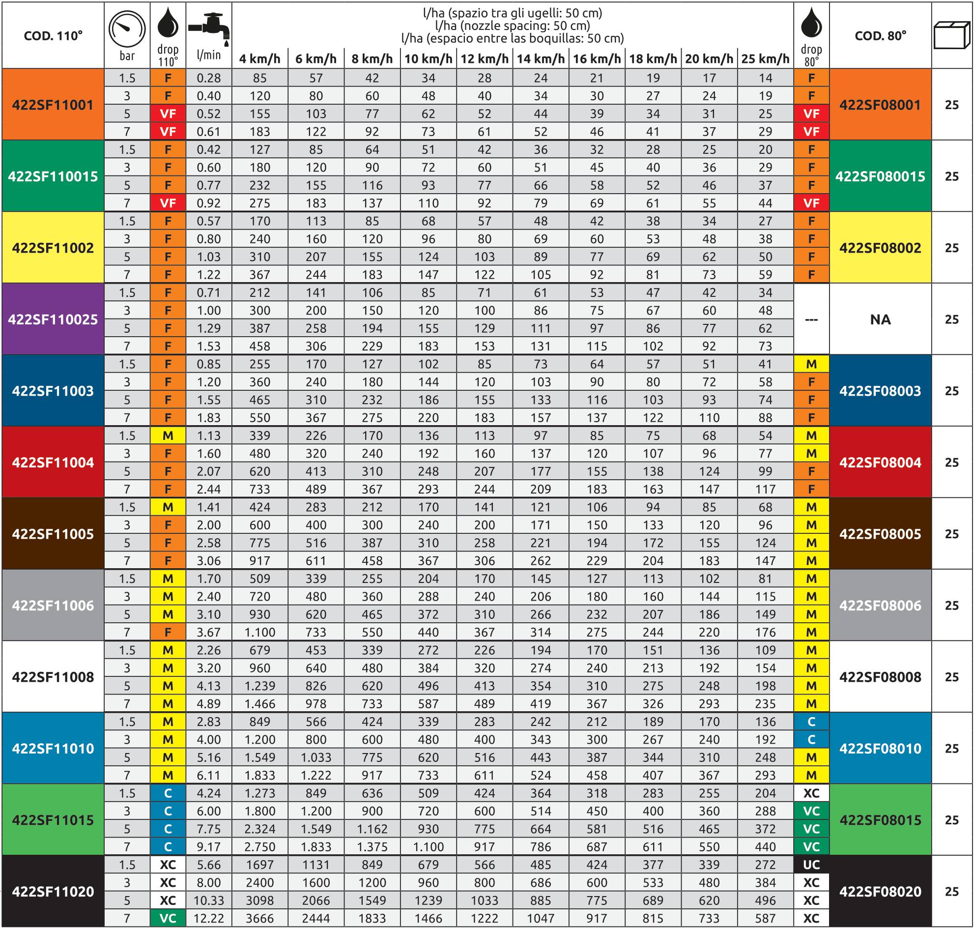 Розпилювачі до обприскувачів SF підходять для суцільного обприскування. Щілинні розпилювачі з еліптичним отвором залишають на ґрунті слід з закругленими краями. Факел має линзовидную форму і рідина більше концентрується в центрі, ніж з зовнішніх сторін. Правильне розташування розпилювача на штанзі є головною умовою для гарантування хороших результатів при обробці культур.